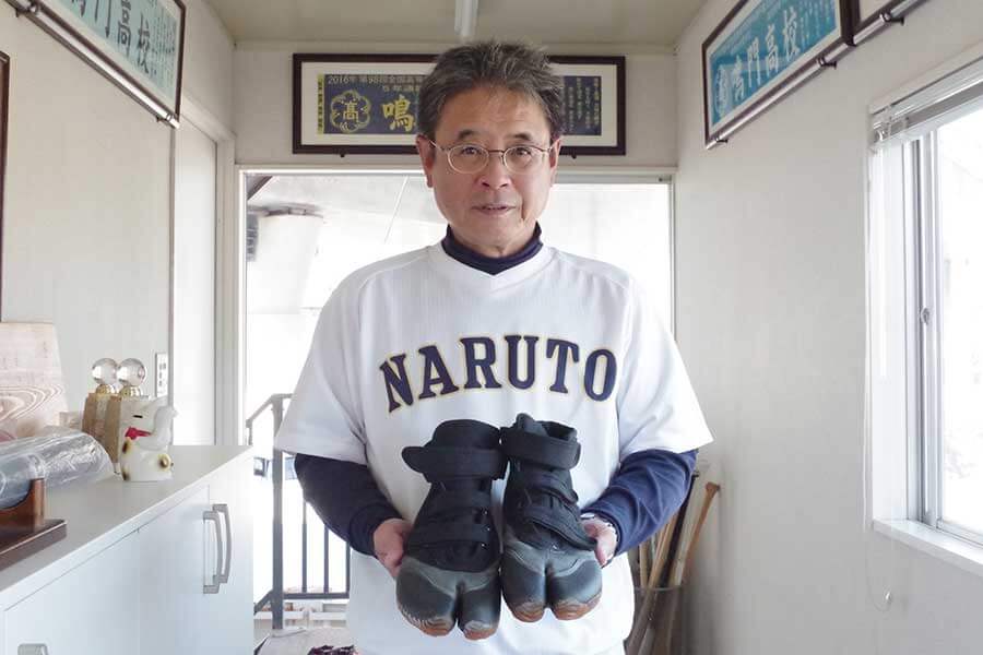 足袋型シューズを手に持つ鳴門・森脇稔監督【写真:喜岡桜】