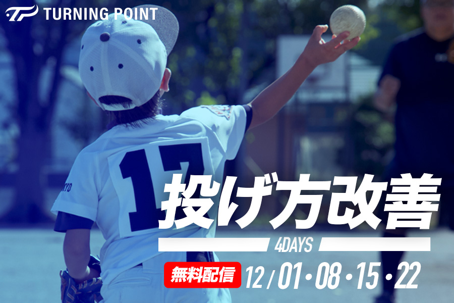 野球育成技術向上プログラム「TURNING POINT」(ターニングポイント)では、無料登録だけでも250本以上の指導・育成動画が見放題。First-Pitchと連動し、小・中学生の育成年代を熟知する指導者や、元プロ野球選手、トップ選手を育成した指導者が、最先端の理論などをもとにした確実に上達する独自の練習法・考え方を紹介しています。