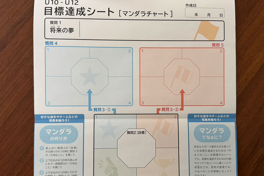 田河内さんが同ノートを企画する上で、必ず入れたいと思ったのが、目標達成に向けてやるべきことをシートに記入する「マンダラチャート」。ドジャースの大谷翔平投手が花巻東高時代に取り組んでいたことで有名だが、通常9×9の81マスで構成されるチャートを埋めるのは、かなり大変な作業だ。そこで一般社団法人マンダラチャート協会の協力を得て、小学生でも取り組みやすい5×5の25マスに改良し、ノートの最初にやるべき作業とした。また、「ジュニアマンダラチャート」の部分は切り取ることができるため、いつも目に見えるところに張り出すことで、意識付けとモチベーション向上につなげる工夫もしている。