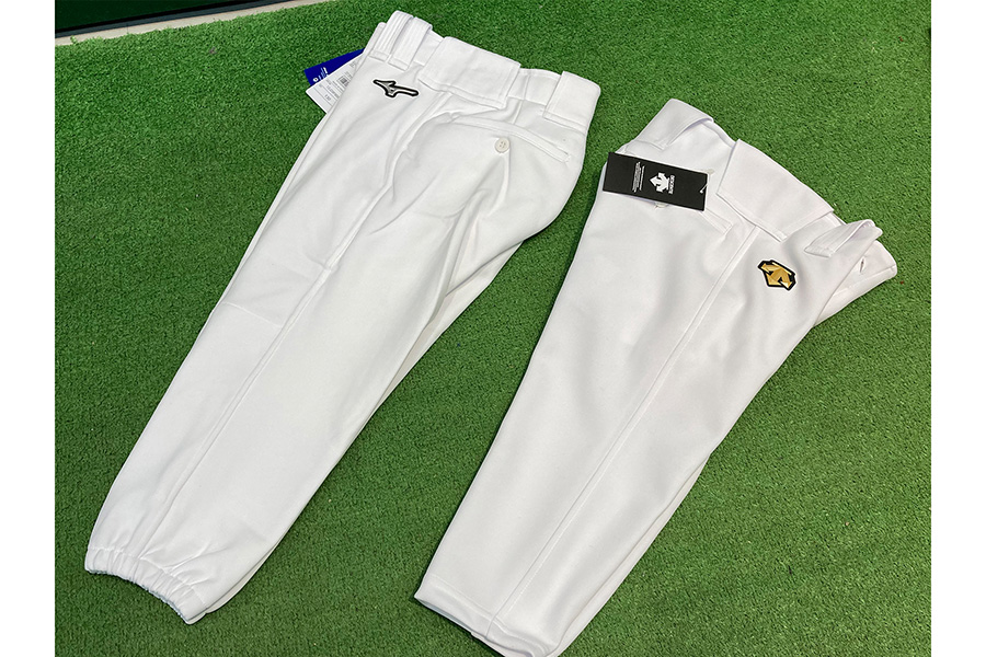 白で無地のシンプルな少年野球用ユニホームパンツも種類がある。野球用品専門店「ベースマン」立川店の店長が選ぶ基準に挙げたのは「伸縮性」と「耐久性」のどちらを重視するのか。洗濯や破れた時に備えて2枚は必要で、穴が開きやすい膝やお尻部分を補修するアイテムもすすめている。