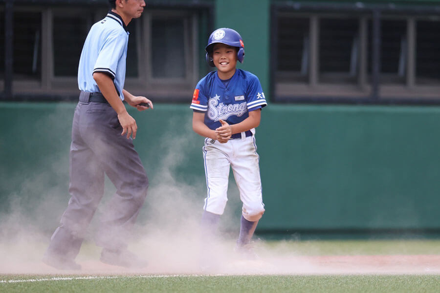 準決勝第2試合は終盤までもつれる一戦となった。新家スターズは、1日の3回戦で完全試合を達成した中条ブルーインパルスの服部成くん(6年)は4回まで無安打投球するなど安定した投球を見せていた。5回に5番・原田奏志くん(6年)に初安打を許すと、7番・西川秀祐くん(6年)の適時三塁打と内野ゴロの間の得点で2点を奪い逆転を許した。