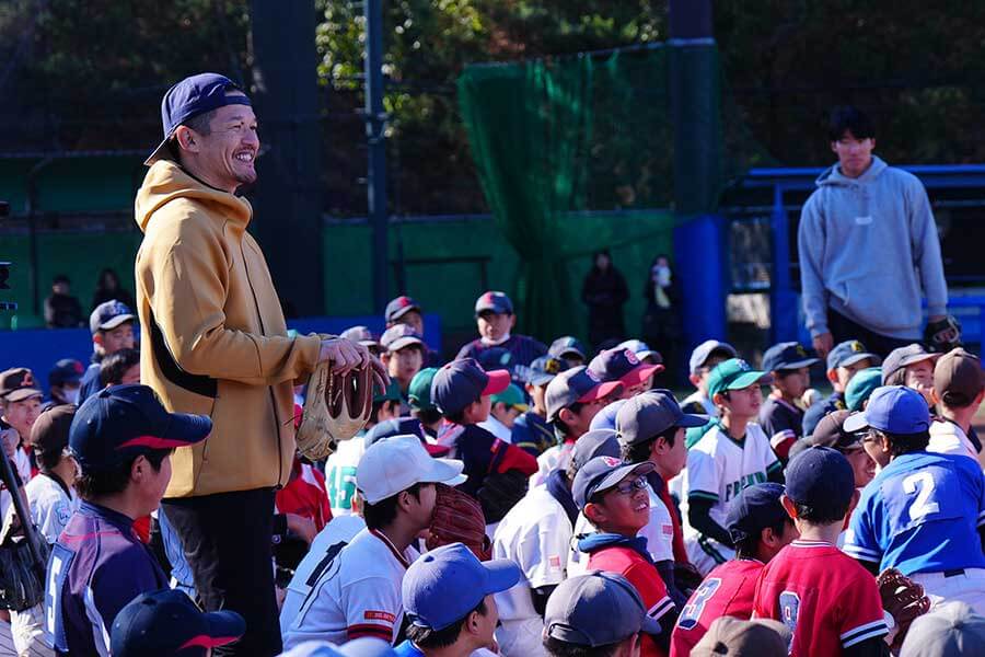 「これでいい?」「難しい!」。3日、東京・西東京市の早大・安部球場で開催された、西東京市、小平市、東久留米市の少年野球チームを対象とした「GRAFARE(グラファーレ)ジュニア野球教室」(タクトホーム株式会社主催)で、坂口智隆さん(元ヤクルト)の周りには、人だかりができていた。