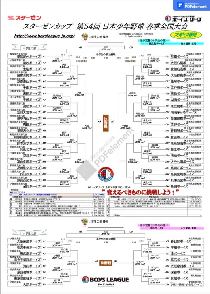 【組み合わせ表】春の頂点を目指す中学44、小学16チームが激突 ボーイズ春季全国大会「スターゼンカップ」