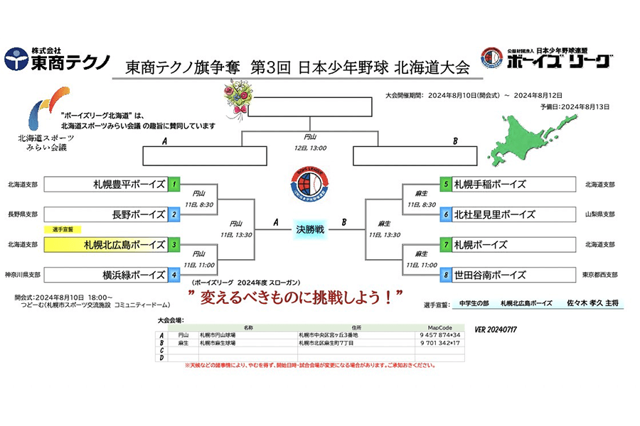 【組み合わせ】北海道と東日本の8チームが短期決戦で“激突” 「第3回日本少年野球北海道大会」