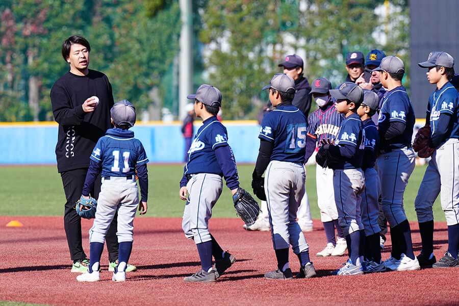高校時代は遊撃手、そしてプロでは一塁手、二塁手として鍛え上げ、ゴールデン・グラブ賞を2度獲得した守備の教えもシンプルだ。「守備は“遊び感覚”でやろう」「腰を低くしようとは思わずに、グラブが地面につけば大丈夫」「何でも前に出るのではなく、打球に応じて判断するのが大事。プロもそれを意識してやっているよ」。教えの通りに実践してうまく捕球できた子どもたちの表情も、自然とほころぶ。