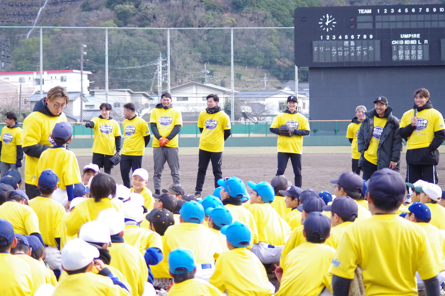 ゴロ捕球の際、打球をグラブに「うまく収める」ポイントがあるという。現役プロ野球選手やOB19人が講師を務める大規模な野球教室「徳島ドリームベースボールプロジェクト」が2025年12月27日、徳島県・むつみスタジアムで開催され、県内の小・中学生550人が参加した。質疑応答の時間も設けられ、徳島インディゴソックスから巨人へ育成ドラフト1位で入団し、2016年から丸10年NPBで戦い続けている増田大輝内野手へ、子どもたちから守備に関する質問が多く寄せられた。