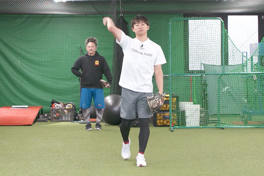 長坂さんが推奨するメニューの1つが「歩きながらスローイング」だ。やり方は極めてシンプル。選手はグラブをつけてボールを握り、投げる相手に向かって正対する。次に相手側に数歩歩いて投げるだけ。投げ終わってもそのまま、真っすぐ歩いていく。