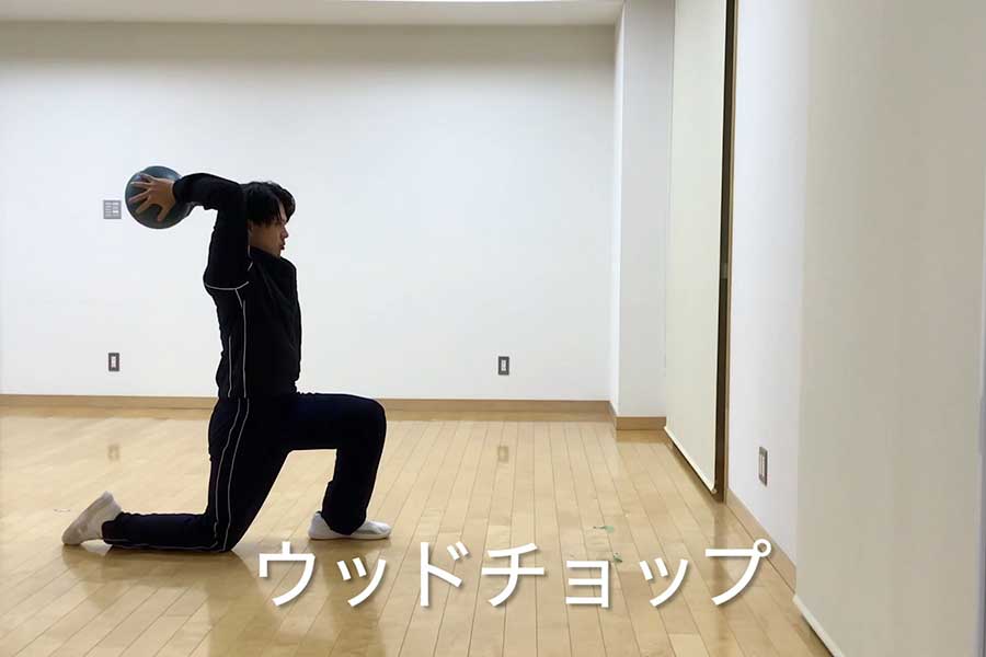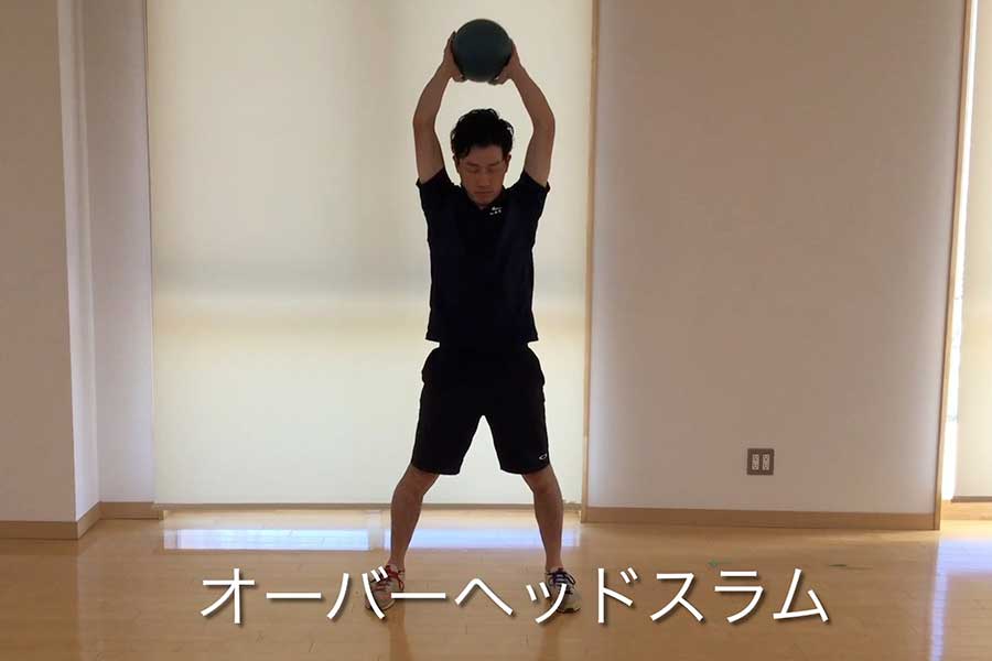 1、メディシンボールを両手で持ち、上から下に叩きつけます