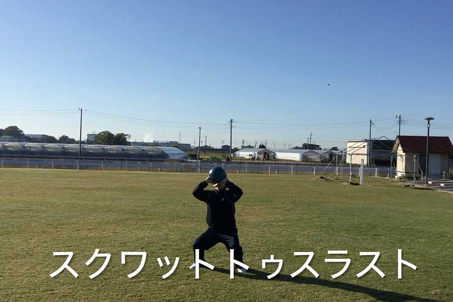 1、スクワットの姿勢となり、胸の前でメディシンボールを持ちます