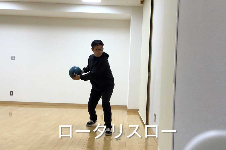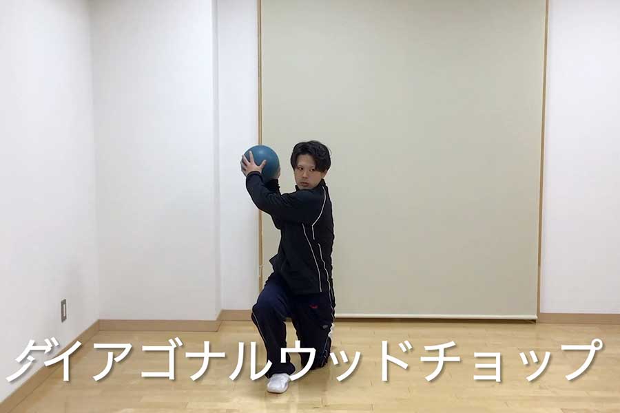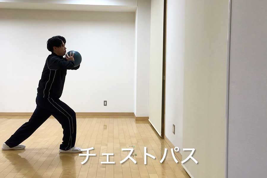 1、メディシンボールを両手で持ち、投球する方向と同じ方向に投げます